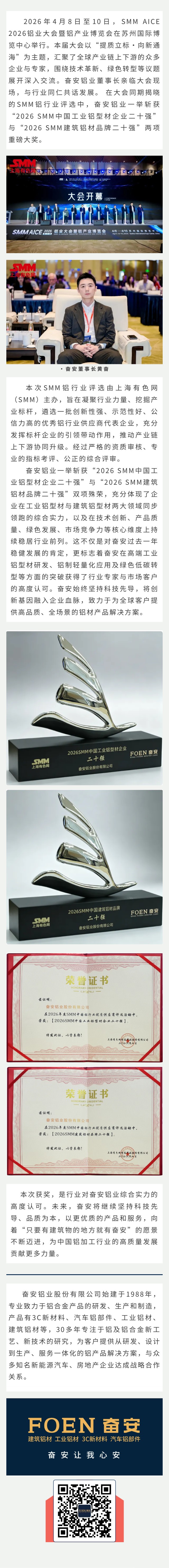 奋安铝业荣膺2026 SMM中国工业铝型材企业二十强、建筑铝材品牌二十强